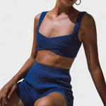 Este conjunto canelado de duas peças é a definição de elegância descontraída. Com linhas simples, tecido de malha suave e corte que abraça o corpo, é perfeito para os dias em que quer estar confortável sem abrir mão do estilo. O top de alças largas com detalhe cruzado e os calções de cintura subida criam uma silhueta moderna, ideal tanto para relaxar em casa como para um look de verão casual e sofisticado.