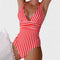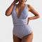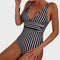 Este fato de banho com decote em V profundo e padrão às riscas foi desenhado para realçar as curvas femininas com um toque de sofisticação. A faixa na zona da cintura proporciona um efeito adelgaçante, enquanto a estrutura confortável oferece liberdade total de movimentos — ideal para momentos de lazer na praia ou na piscina. Uma peça que combina charme, conforto e estilo intemporal.