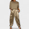 Feito com seda macia e respirável, este conjunto combina elegância e versatilidade, tornando-o ideal tanto para o uso diário como para saídas à noite. A blusa de meia manga adiciona sofisticação, enquanto as calças de corte solto garantem máximo conforto e liberdade de movimento.