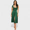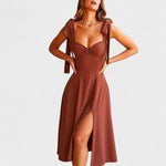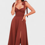 Este vestido midi é a definição de feminilidade com um toque arrojado. Com alças em laço que dão um charme extra, decote estruturado que valoriza o peito e uma racha frontal subtil que revela na medida certa, é ideal para ocasiões especiais ou jantares de primavera e verão.