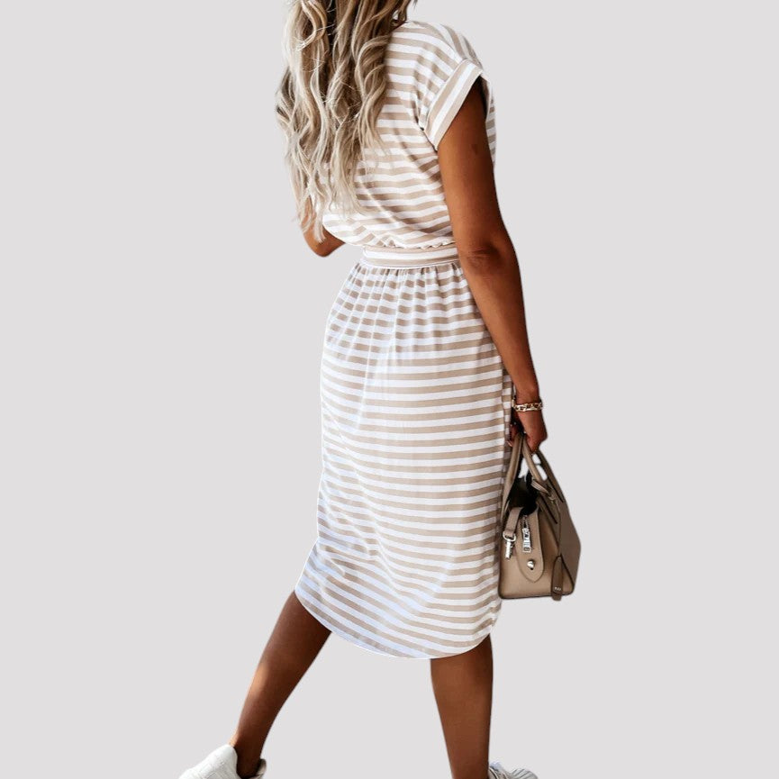 Este vestido elegante de riscas traz o equilíbrio perfeito entre modernidade e conforto. Seu design fluido e a cintura marcada com faixa proporcionam uma silhueta suave e feminina, ideal para qualquer ocasião. Seja para um dia de trabalho ou um evento casual, o vestido é uma escolha versátil e sofisticada. Com um tecido leve e respirável, você vai se sentir confiante e confortável durante todo o dia.