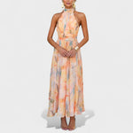 Este vestido fluido e sofisticado é a escolha perfeita para os dias quentes em que deseja sentir-se leve, feminina e absolutamente deslumbrante. Com um padrão aquarelado em tons suaves de pêssego, coral e azul, e um corte que valoriza a silhueta, este vestido é uma celebração da elegância natural. O decote halter e a cintura marcada realçam a forma com delicadeza, enquanto o tecido leve acompanha cada passo com graça