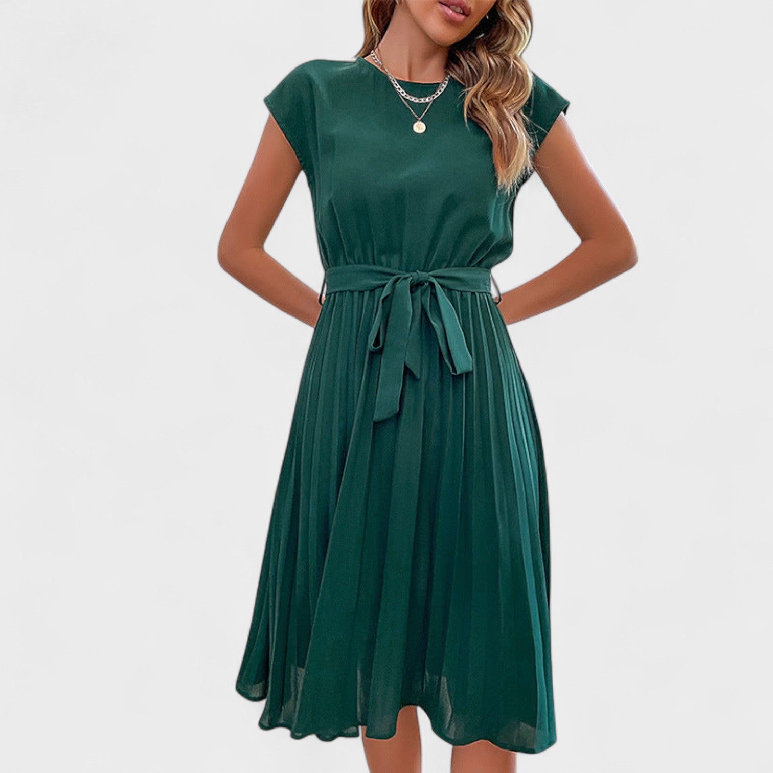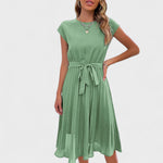 Descubra o equilíbrio ideal entre sofisticação e conforto com este vestido de corte fluido e acabamento impecável. Com modelagem evasê, mangas delicadas e cintura marcada por um laço ajustável, ele valoriza a silhueta com charme e leveza.